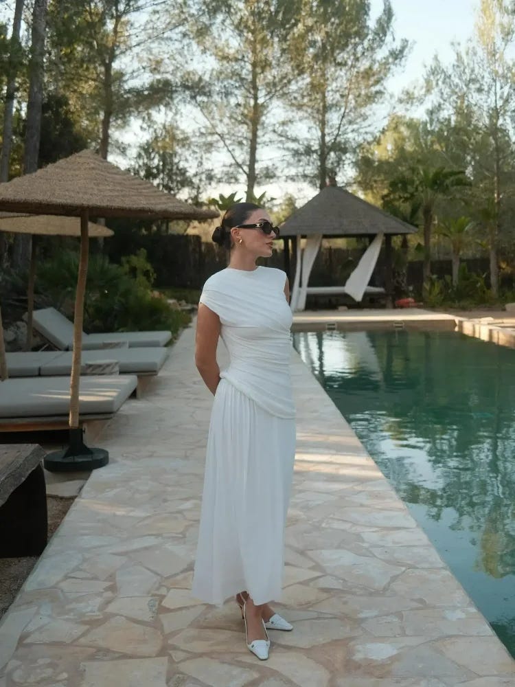 Another fundamental silhouette is a drapey, long white or cream dress. I love seeing brides incorporate a look that leans as heavily on draping as this one. This Lariarti dress is $83 and perfect for those occasions.