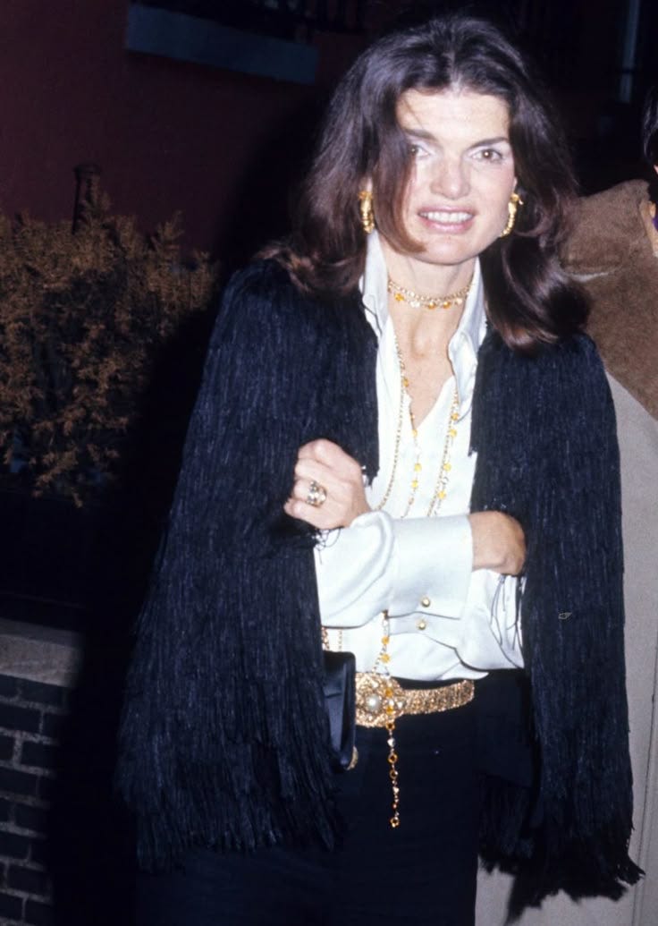 Low block heels, worn with everything from trousers to skirts were key in the style icon’s wardrobe. Like you, Long Live reader, she prized comfort. Jackie famously hated high heels, calling them impractical for her active New York life. In the ‘70s, she adopted low stacked-heel boots (often from Gucci or Ferragamo) that she could wear for walking miles through Manhattan or riding horses in New Jersey.