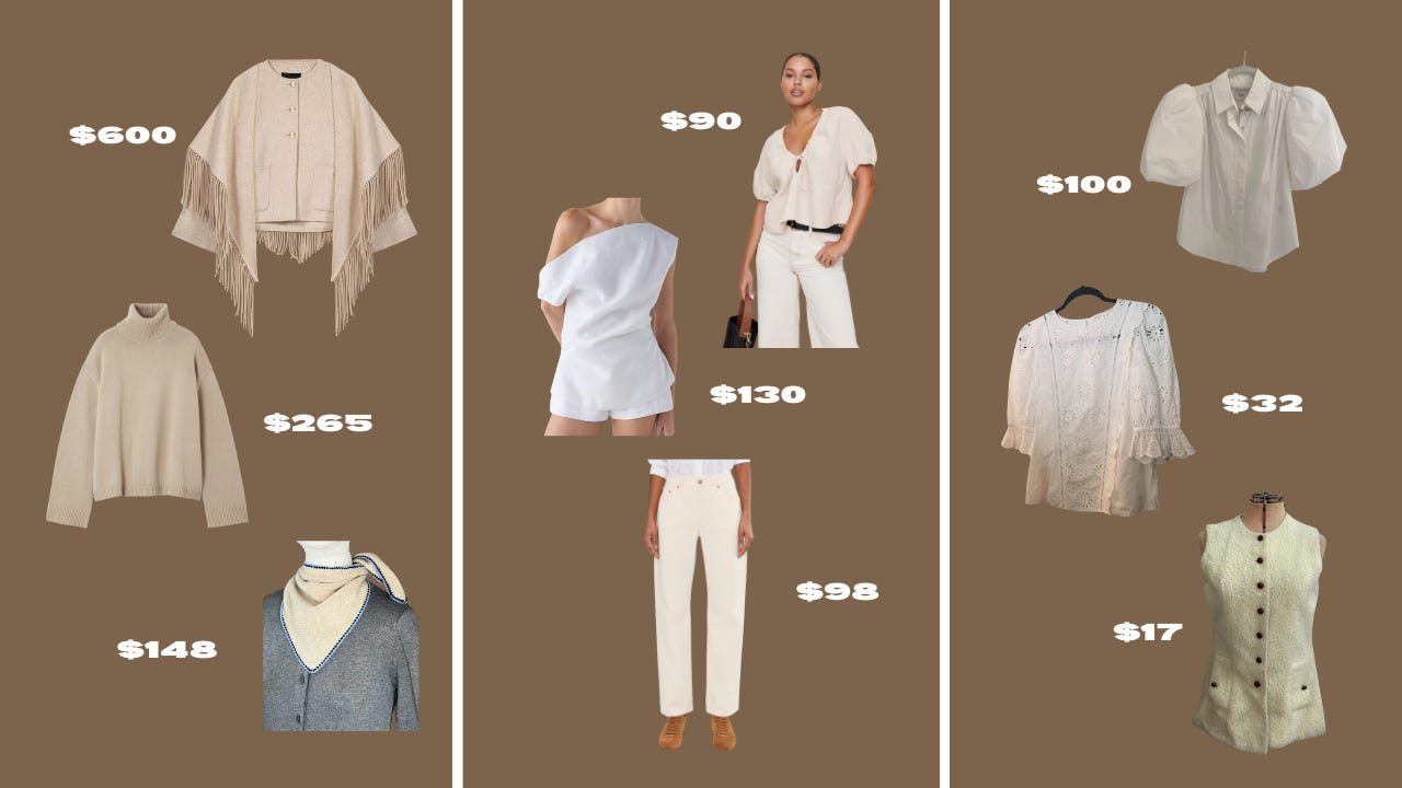Splurge: Maje statement coat, Oversized turtleneck, Cashmere scarf / Save: BR linen top, Cool linen tank, Excellent white-ish jeans / Secondhand: Preloved puffy sleeve Aje, Frilly Veronica Beard, This vest!!