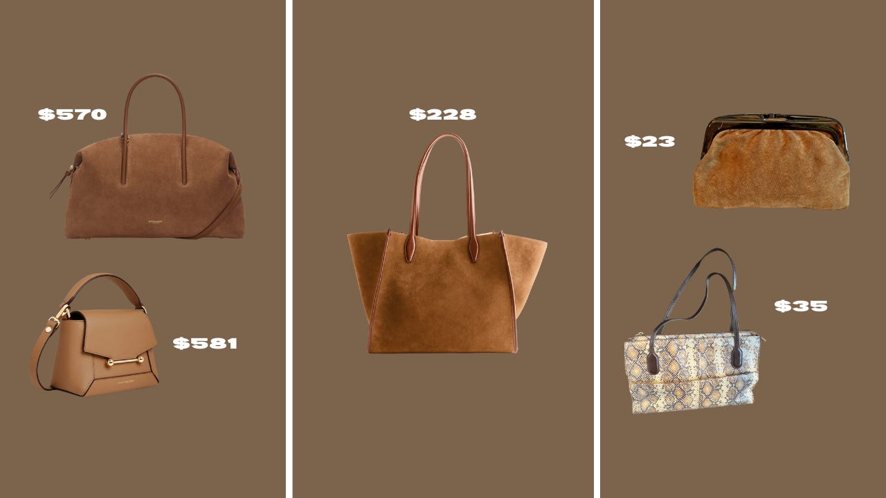 Splurge: Suede crossbody, Convertible leather / Save: Ideal Madewell tote / Secondhand: Suede clutch, Snakeskin shoulder bag